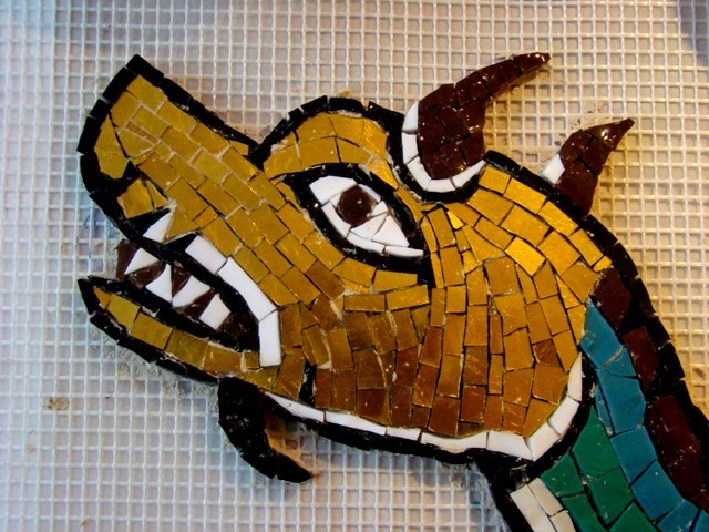 Tête réalisée à l'aide de tesselles d'or, contours et détail en smalte...